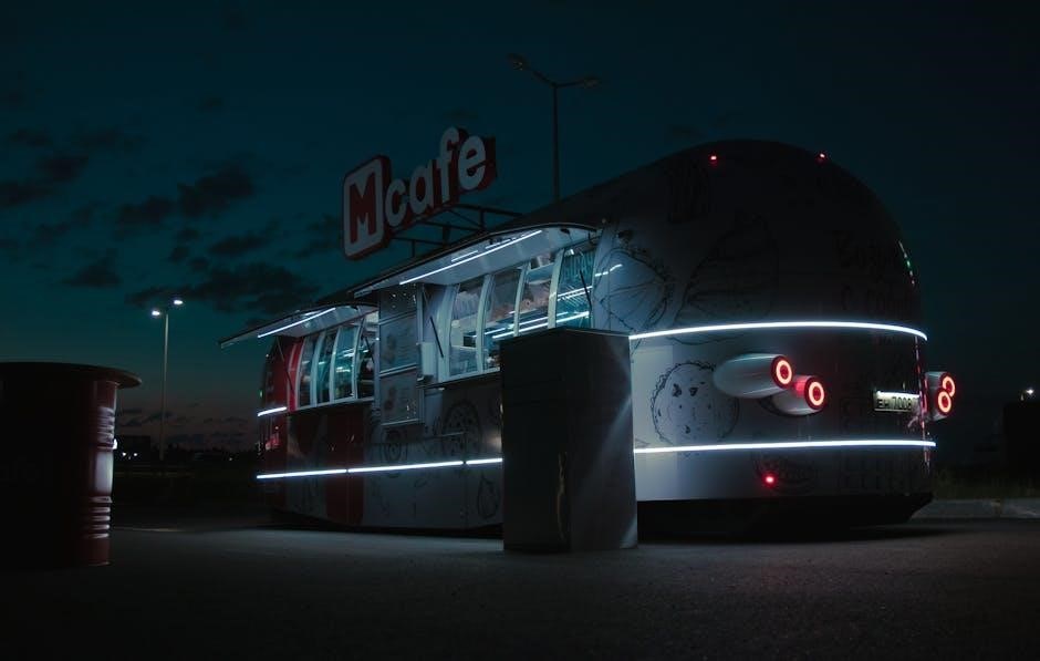 A well-structured food truck business plan is essential for success, outlining clear objectives, market strategies, and financial projections․ It begins with an executive summary, providing an overview of the business, followed by detailed market analysis to identify target audiences and competitors․ The menu and product offerings are central, emphasizing quality and uniqueness to attract customers․ Marketing and sales strategies, including branding and social media, are critical for visibility and customer retention․ Operational plans cover location selection, equipment, and staffing, ensuring smooth daily operations․ Financial planning includes startup costs, revenue projections, and expense management to maintain profitability․ Legal requirements, such as licenses and health regulations, must be thoroughly addressed․ By following this structured approach, a food truck business can achieve sustainability and growth in a competitive market․